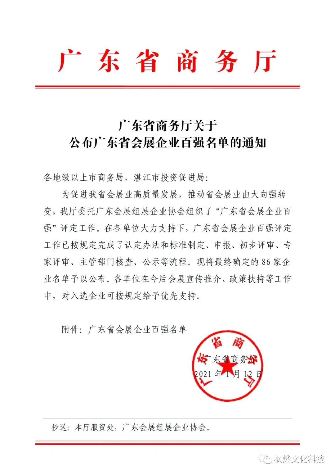 1月12日,广东省商务厅发布了广东省会展企业百强公示名单,